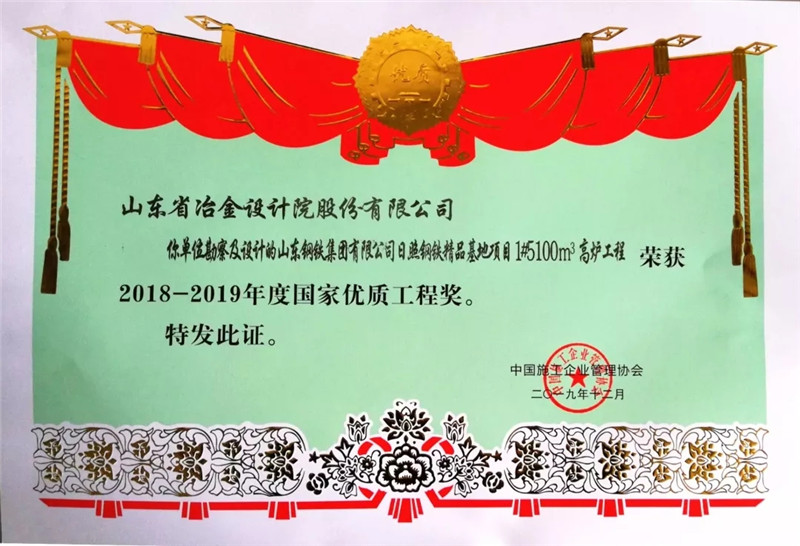 12月8日,2018-2019年度國家優(yōu)質(zhì)工程獎總結表彰大會在國家會議中心舉行,由山冶設計總體規(guī)劃、自主設計并采取“EPC”總承包模式建成的山鋼集團日照精品基地1#5100m3高爐工程喜獲國家優(yōu)質(zhì)工程獎。