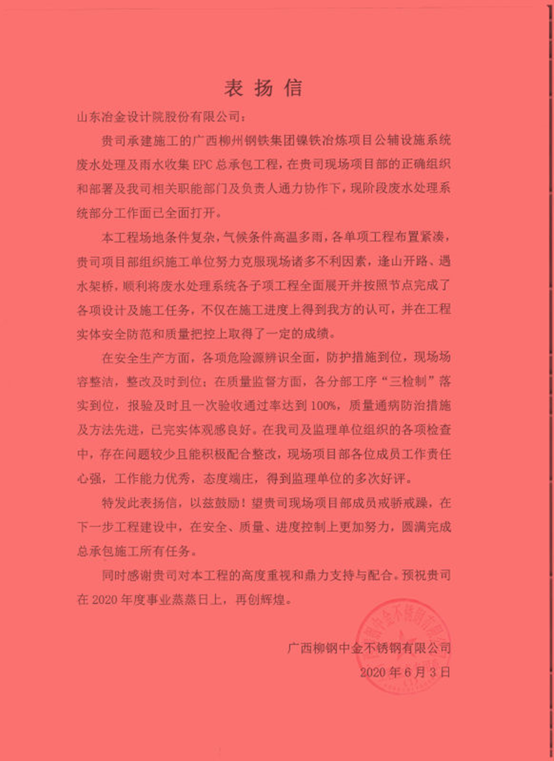 近日,公司總承包的廣西柳州鋼鐵集團鎳鐵冶煉項目公輔設(shè)施系統(tǒng)廢水處理及雨水收集工程項目部收到業(yè)主表揚信,稱贊項目部在安全、質(zhì)量等各方面措施到位,在廣西鋼鐵廠的各項檢查中,存在問題較少且積極配合整改,對項目部全體成員的工作態(tài)度、工作能力給予了充分肯定。