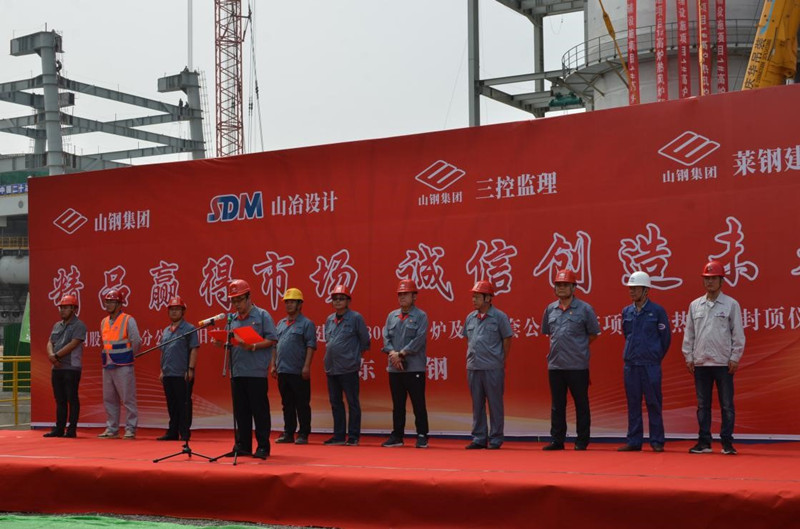 2020年6月28日9點(diǎn)50分,公司總包的山鋼股份萊蕪分公司新舊動能轉(zhuǎn)換項目1號3800m3高爐熱風(fēng)爐順利封頂!山鋼股份萊蕪分公司新舊動能轉(zhuǎn)換項目工程指揮部副指揮孫建設(shè),山鋼股份萊蕪分公司煉鐵廠經(jīng)理、高爐工程項目經(jīng)理部經(jīng)理張明,新舊動能轉(zhuǎn)換項目工程指揮部高爐工程項目經(jīng)理部常務(wù)副經(jīng)理賈友劍,萊蕪三控冶金建設(shè)監(jiān)理事務(wù)所經(jīng)理沈桂聯(lián),我公司黨委書記、副總經(jīng)理谷卓奇,萊蕪鋼鐵集團(tuán)建筑安裝工程有限公司黨委書記、董事長時元海,萊蕪鋼鐵集團(tuán)建筑安裝工程有限公司副經(jīng)理梁博,上海二十冶萊鋼高爐項目部項目經(jīng)理李虎,中國十九冶萊鋼高爐公輔項目部項目副經(jīng)理田澤龍,河北省安萊鋼高爐噴煤及鑄鐵機(jī)項目部項目經(jīng)理王紅帥,中十冶萊鋼主控樓項目部項目經(jīng)理馬少華出席了儀式。