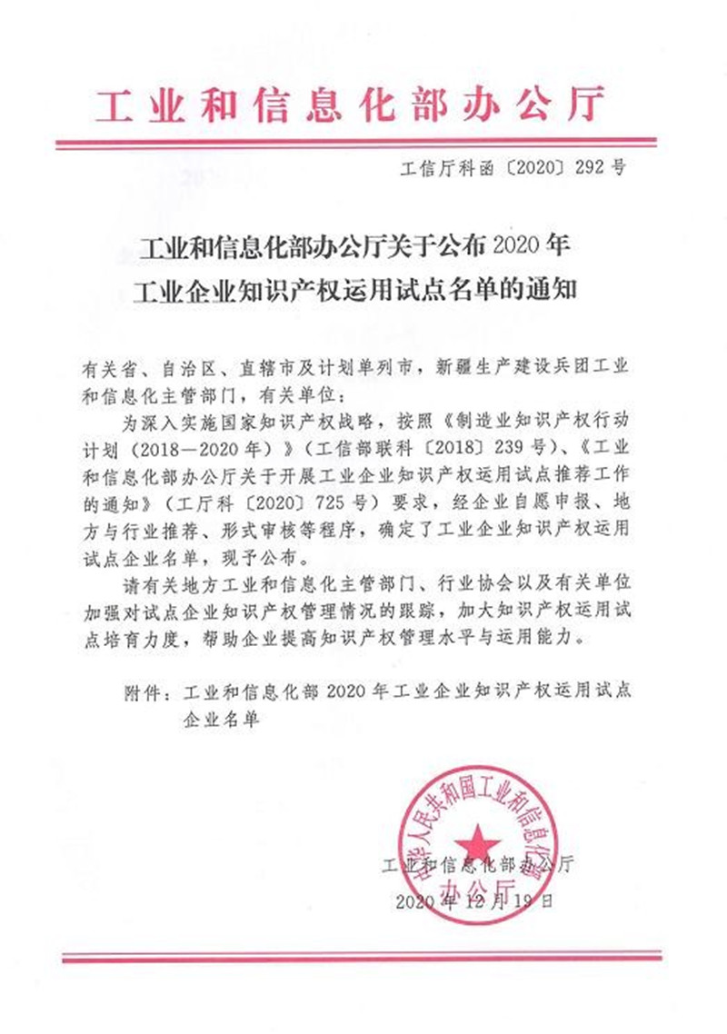 公司入選工信部2020年工業(yè)企業(yè)知識(shí)產(chǎn)權(quán)運(yùn)用試點(diǎn)單位