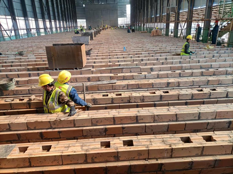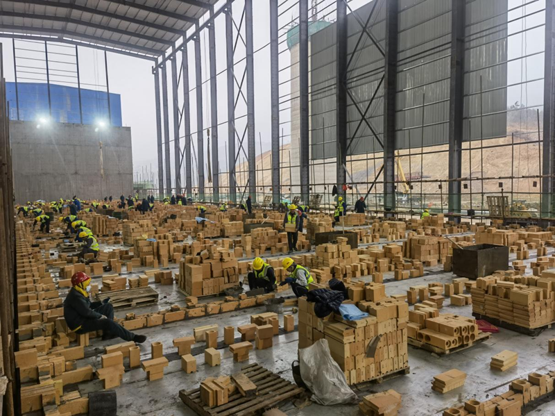 云煤能源焦化升級(jí)項(xiàng)目建設(shè)的7.6m頂裝焦?fàn)t,2座焦?fàn)t用磚量7萬(wàn)噸,磚型多達(dá)1000多種,磚型復(fù)雜,對(duì)耐材生產(chǎn)供貨及管理要求很高,公司領(lǐng)導(dǎo)在耐材訂貨時(shí)就高瞻遠(yuǎn)矚十分重視、派遣數(shù)位人員駐廠監(jiān)制,云煤焦?fàn)t砌筑工期十分緊張,加上現(xiàn)階段國(guó)內(nèi)新建焦?fàn)t較多耐材供應(yīng)本就較緊張,以及受疫情以及冬奧會(huì)影響,生產(chǎn)供應(yīng)更加困難。云煤1#焦?fàn)t砌筑時(shí)間與山冶負(fù)責(zé)設(shè)計(jì)與項(xiàng)目管理的山西盛隆泰達(dá)項(xiàng)目砌筑時(shí)間相近,且粘土磚生產(chǎn)廠家均包含濟(jì)源耐火爐業(yè),粘土磚供應(yīng)保障壓力極大。為了保證砌筑進(jìn)度,云煤項(xiàng)目部積極協(xié)調(diào)各方、千方百計(jì)保證耐材供貨以滿足砌筑需求。一方面派遣專業(yè)工程師駐廠催交監(jiān)制,另一方面協(xié)調(diào)其他耐材生產(chǎn)廠家協(xié)助粘土磚生產(chǎn)保供應(yīng)。項(xiàng)目管理分公司負(fù)責(zé)耐材管理的石景林,每天不辭辛苦聯(lián)系廠家發(fā)貨、溝通到貨時(shí)間、協(xié)調(diào)施工方卸貨,晚上還要統(tǒng)計(jì)每天10~20車數(shù)百個(gè)磚號(hào)的到貨量。在耐材砌筑質(zhì)量管理方面,我們外聘了2位有豐富施工與砌筑經(jīng)驗(yàn)的老同志,為焦?fàn)t砌筑施工質(zhì)量保駕護(hù)航。