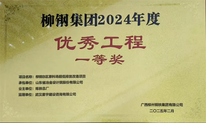 由山冶設(shè)計EPC總承包的柳鋼B區(qū)原料場超低排放改造項目成績斐然,榮獲廣西柳鋼集團2024年度優(yōu)秀工程一等獎及2024年度安全文明施工標(biāo)準(zhǔn)化工地兩項殊榮,這體現(xiàn)了柳鋼集團對該項目施工及現(xiàn)場管理的高度認(rèn)可。