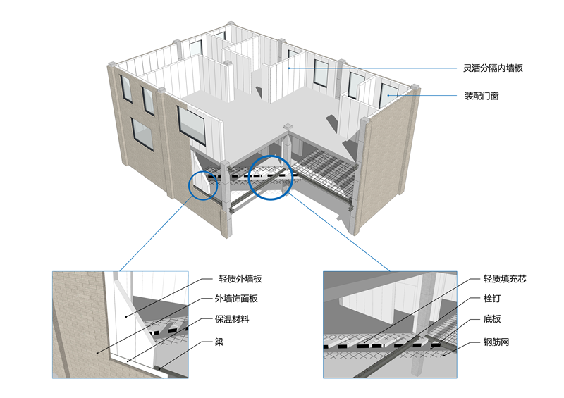 隱梁裝配式鋼結(jié)構(gòu)建筑集成體系:以建筑功能為核心,以結(jié)構(gòu)布置為基礎(chǔ),以工業(yè)化的圍護、內(nèi)裝和設(shè)備管線部件為支撐,綜合考慮建筑布局、外立面、結(jié)構(gòu)體系、圍護結(jié)構(gòu)、設(shè)備管線、構(gòu)件防護、內(nèi)裝等各方面的協(xié)同與集成,實現(xiàn)了主體鋼結(jié)構(gòu)系統(tǒng)、外圍護系統(tǒng)、設(shè)備管線系統(tǒng)、內(nèi)裝系統(tǒng)協(xié)同,將鋼梁隱藏于樓板或墻體內(nèi),避免鋼結(jié)構(gòu)外露對使用功能的影響,解決了鋼結(jié)構(gòu)防腐、防火問題,同時還發(fā)揮出了裝配式鋼結(jié)構(gòu)建筑在大空間靈活分隔方面的優(yōu)勢。